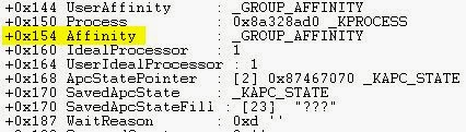 Using the _KTHREAD data structure with the address of a selected thread, we can see the _GROUP_AFFINITY data structure: